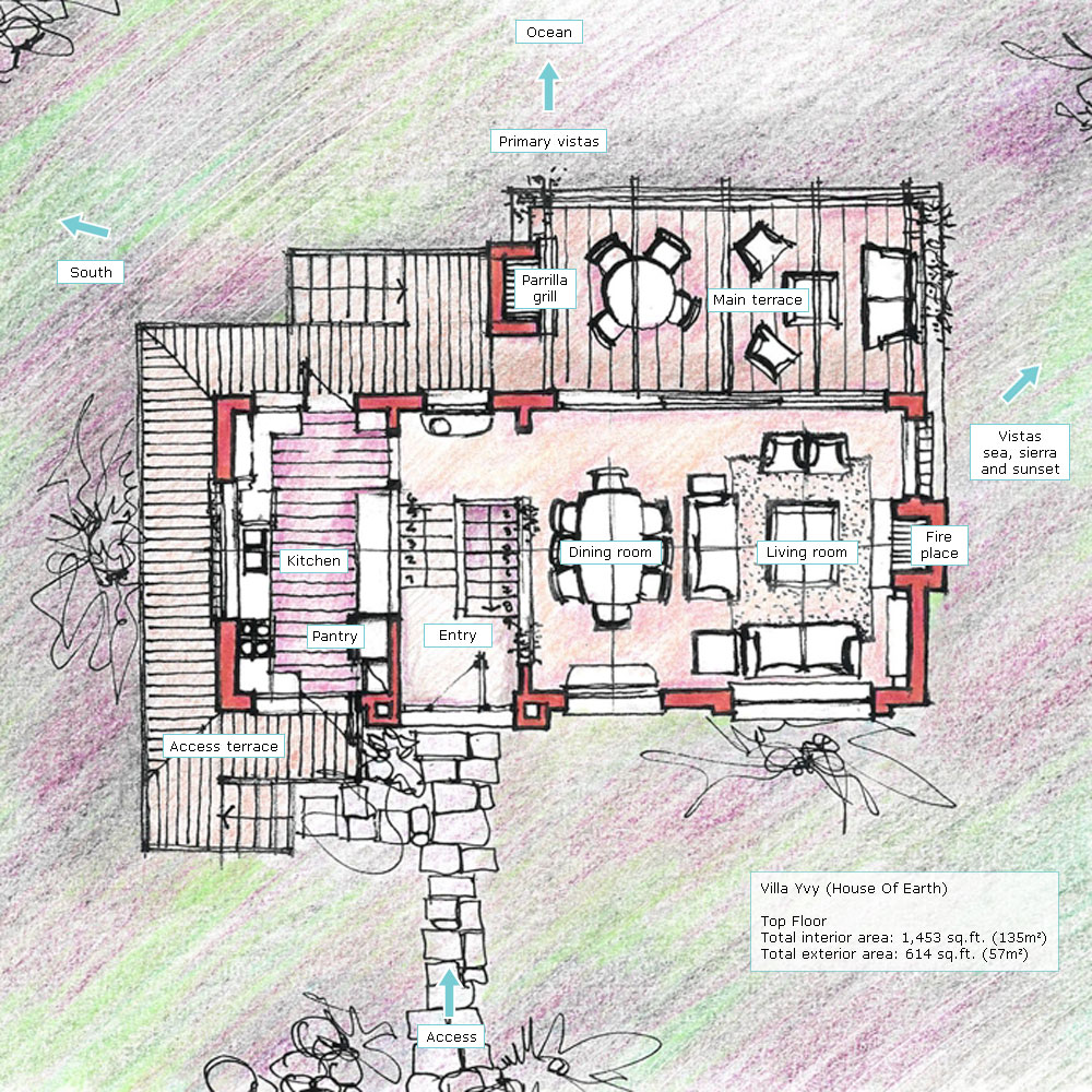 Interior area: 1,453 sq.ft. (135m2) Villa Yvy is a fusion of Latin American contemporary architecture with 2 bedrooms, 2 bathrooms, 2 walk-in closets, a living room, dining room, kitchen, pantry, a safe, an owner's storage, as well as, a fireplace, ample terrace space, and a Uruguayan style parrilla (grill) facing the sea.Our homes are of superior quality construction; built to last for hundreds of years. They are made with a solid concrete superstructure and a double brick wall, which means the walls are about 14 inches thick. The windows are double-pane glass, which means they are energy efficient. The kitchen counter tops are granite, the bathroom counter tops are marble, and the floors are Spanish tile. Landscaping can be described as manicured nature with Eastern influences. The technique is called Xeriscape, which uses indigenous plants and rock to blend in with the natural environment. See Feng Shui section of the website for private Feng Shui consultations. |