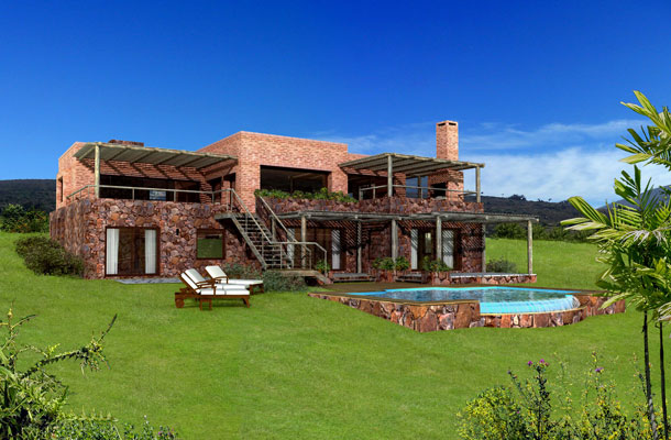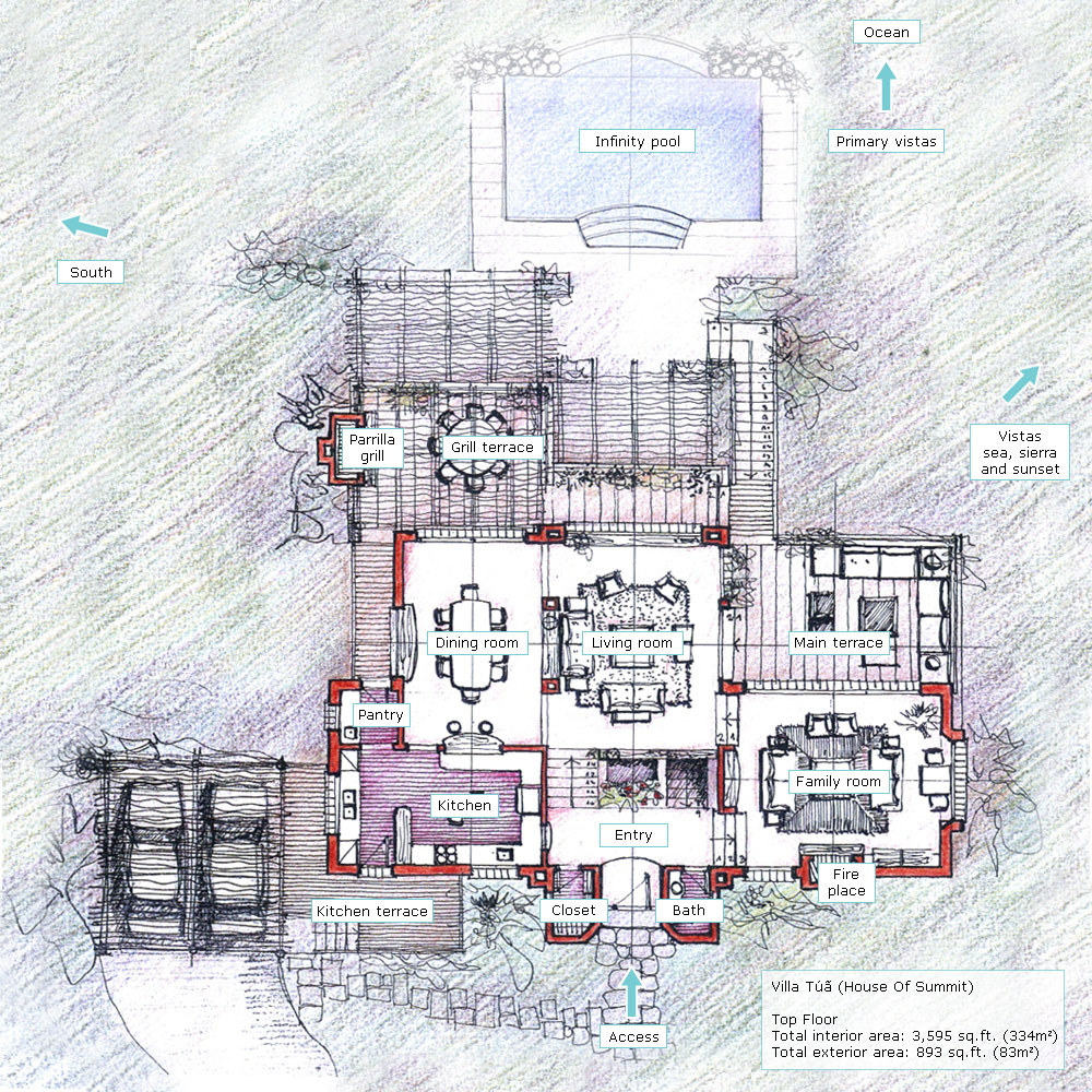 Área interior: 3.595 pies cuadrados (334 m2) El chalet Túã es el chalet más grande y lujoso con las mejores vistas de la propiedad. El chalet Túã es la única residencia que incluye un terreno de medio acre (más de dos mil m2). Es una combinación de arquitectura contemporánea latinoamericana con 4 dormitorios, 4 ½ baños, un jacuzzi, 3 vestidores, estar, sala, comedor, cocina, despensa, caja fuerte, y galpón, así como estufa a leña, terrazas amplias, un parrillero de estilo uruguayo, y una piscina sin fin que se une con el mar.Nuestras casas tienen una construcción de calidad superior y están construidas para durar cientos de años. Están hechas de una superestructura de concreto sólido y una pared con doble capa de ladrillos, lo que significa que tienen un ancho de unas 14 pulgadas (35 cm). Las aberturas tienen doble ventana, lo que significa que ahorran energía. Las mesadas de la cocina son de granito, las de los baños de mármol y los pisos de cerámica española. El paisajismo se puede describir como una naturaleza muy cuidada con influencias orientales. Vea la sección Feng Shui de nuestro sitio para realizar consultas privadas. |