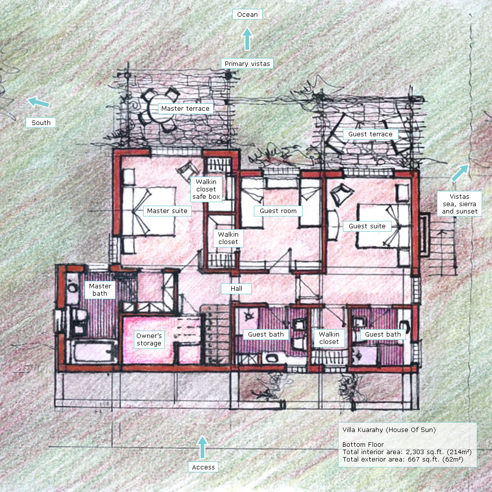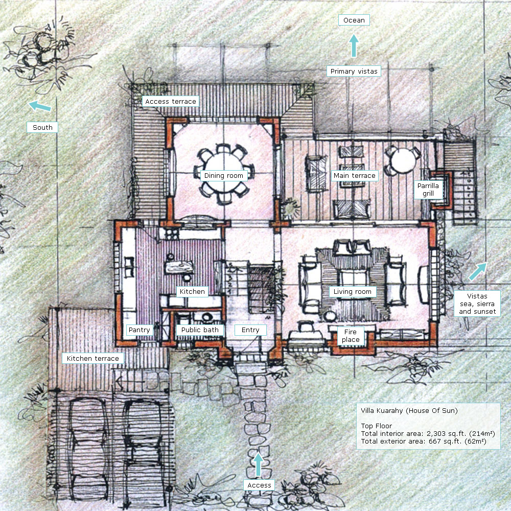 Interior area: 2,303 sq.ft. (214m2) Villa Kuarahy is a blend of Latin American contemporary architecture with 3 bedrooms, 3 ½ bathrooms, 3 walk-in closets, a generous living room, dining room, kitchen, pantry, a safe, an owner's storage, as well as, a fireplace, ample terrace space, and a Uruguayan style parrilla (grill) facing the sea.Our homes are of superior quality construction; built to last for hundreds of years. They are made with a solid concrete superstructure and a double brick wall, which means the walls are about 14 inches thick. The windows are double-pane glass, which means they are energy efficient. The kitchen counter tops are granite, the bathroom counter tops are marble, and the floors are Spanish tile. Landscaping can be described as manicured nature with Eastern influences. The technique is called Xeriscape, which uses indigenous plants and rock to blend in with the natural environment. See Feng Shui section of the website for private Feng Shui consultations. |