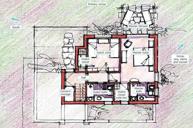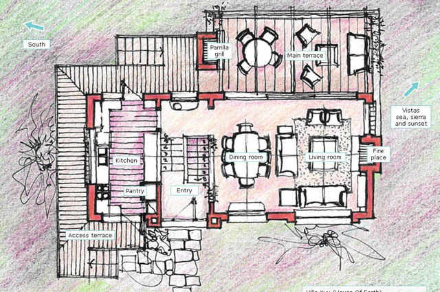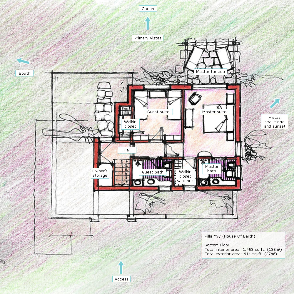 Interior area: 1,453 sq.ft. (135m2) Villa Yvy is a fusion of Latin American contemporary architecture with 2 bedrooms, 2 bathrooms, 2 walk-in closets, a living room, dining room, kitchen, pantry, a safe, an owner's storage, as well as, a fireplace, ample terrace space, and a Uruguayan style parrilla (grill) facing the sea.Our homes are of superior quality construction; built to last for hundreds of years. They are made with a solid concrete superstructure and a double brick wall, which means the walls are about 14 inches thick. The windows are double-pane glass, which means they are energy efficient. The kitchen counter tops are granite, the bathroom counter tops are marble, and the floors are Spanish tile. Landscaping can be described as manicured nature with Eastern influences. The technique is called Xeriscape, which uses indigenous plants and rock to blend in with the natural environment. See Feng Shui section of the website for private Feng Shui consultations. |